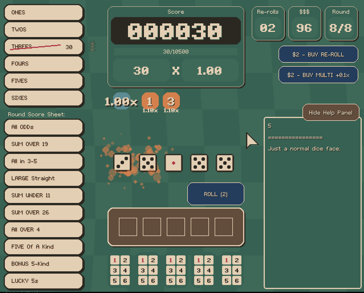 LoJam 2025 entry. A crazy dice-building, yahtzee-scoring, rogue-lite where you'll need both luck and strategy to win.